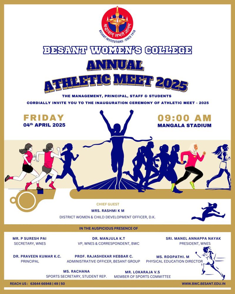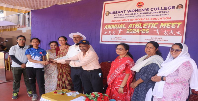 The 47th Annual Athletic Meet was organized by the Department of Physical Education at Mangala Stadium on Friday, April 4, 2025. Mrs. Rashmi K. M., District Women and Child Development Officer of Dakshina Kannada, was the chief guest for the event.