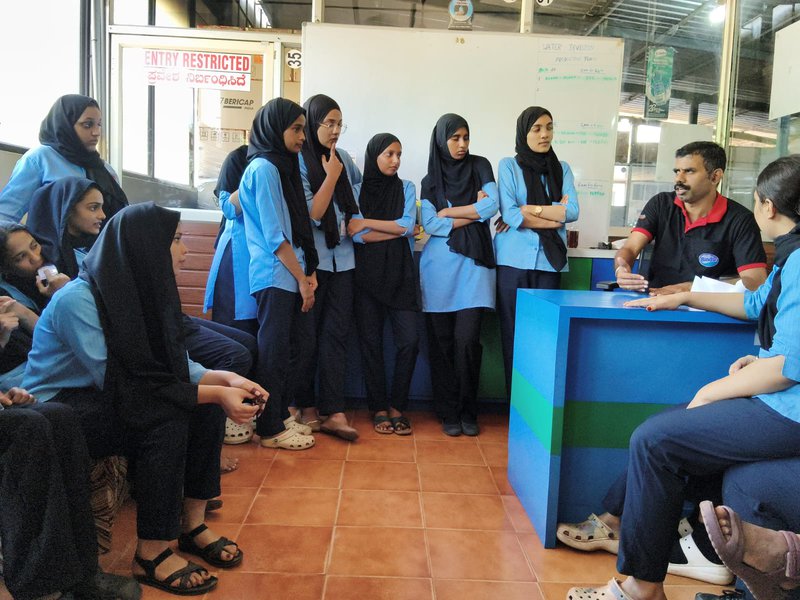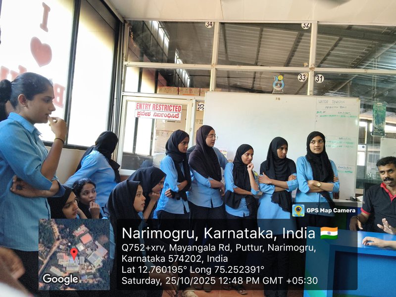 The second visit was to Bindu Industry, a well-known beverage manufacturing unit in Puttur. The factory is engaged in the production of a variety of soft drinks, fruit juices, and flavored beverages. Upon arrival, the students were warmly received by the factory staff and were given an overview of the company’s history, product range, and production process.