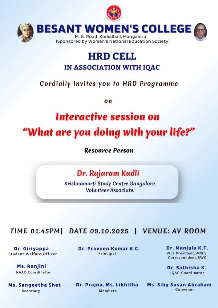 A thought-provoking interactive session on the theme “What are you doing with your life?” was organized by the HRD Cell. The event aimed to inspire students and faculty to reflect on the deeper meaning of life, encouraging mindfulness, self-discovery, and purposeful living.
