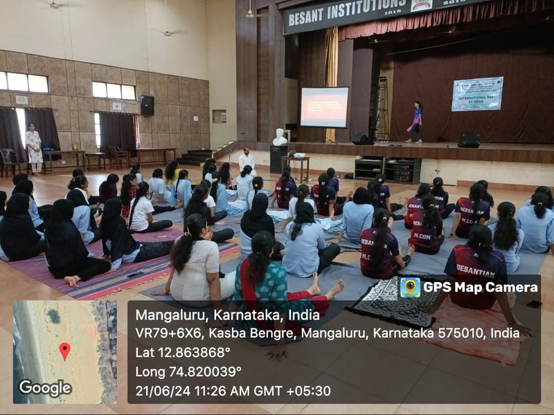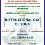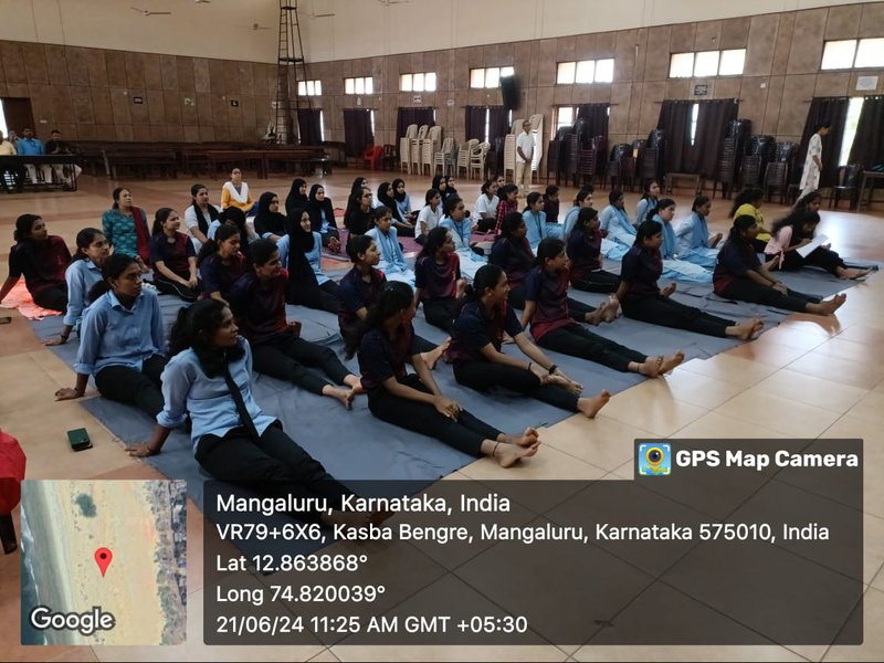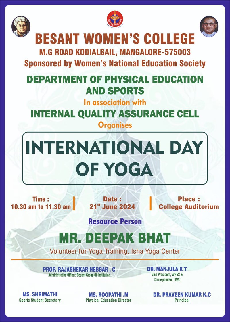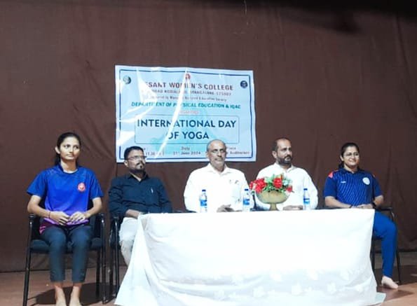 The celebration of the 10th International Day of Yoga was a great success, fulfilling its objectives of spreading awareness about yoga and its immense benefits. The department of physical education in association with IQAC, organized the 10th International Day of Yoga on 21/06/2024 at College Auditorium for the students and lectures. The session began with a welcome note by the Roopathi.M, Physical Education Director, followed by insights from Mr. Deepak Bhat on the science of yoga. He led a practice session including: