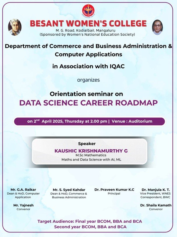An Orientation Seminar on “Data Science Career Roadmap” was organised by the Department of Commerce and Business Administration & Computer Applications in association with IQAC at Besant Women’s College, Mangaluru, on 2nd April 2025 at 2:00 PM in the auditorium.
