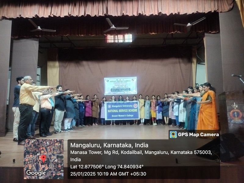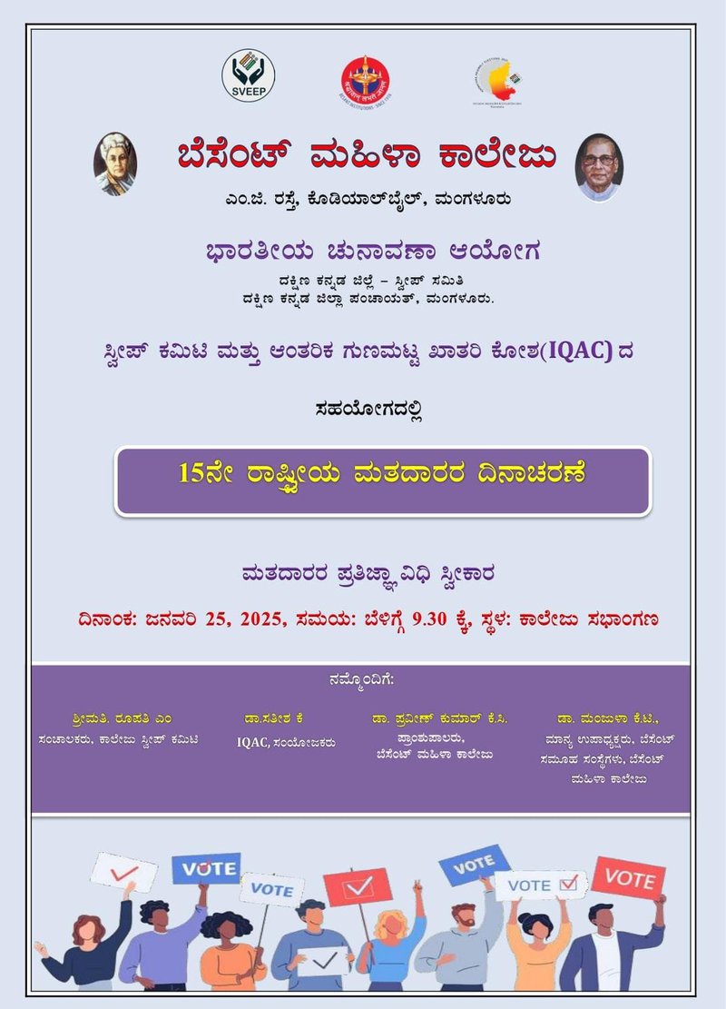The College SVEEP Committee, in association with IQAC, organized a Voters' Pledge Taking Programme on the occasion of the 15th National Voters' Day on 25th January 2025. The event took place at the college auditorium at 9:30 AM and witnessed active participation from students, faculty, and staff. The programme aimed to promote democratic values and encourage responsible electoral participation among young voters. Participants solemnly took the pledge to uphold the democratic process and exercise their right to vote responsibly. The event served as a reminder of the power and duty of every citizen in a democracy.