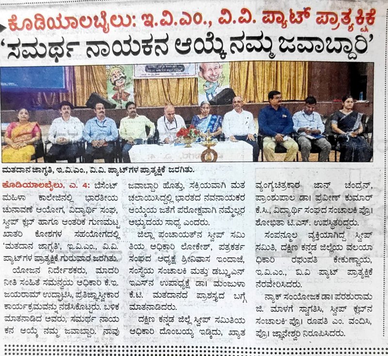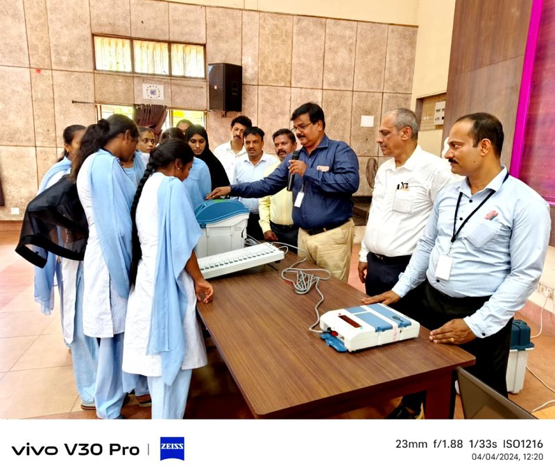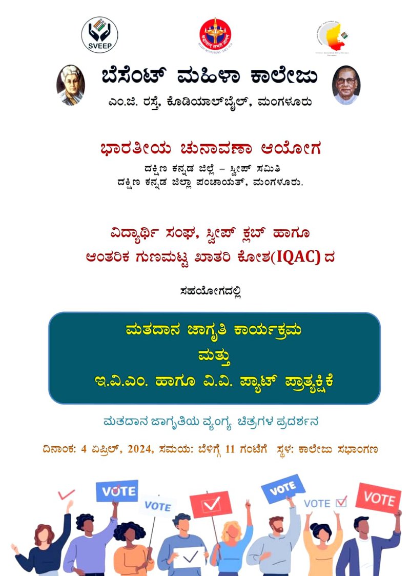 College SVEEP Committee and IQAC, in association with the Election Commission of India, Dakshina Kannada District-SVEEP Committee, Mangalore, organized a Voting Awareness Programme and Demonstration of EVM and VVPAT on 04/04/2024. The event was held at the college auditorium from 11:00 am to 1:00 pm. Students and faculty participated actively in the session, which aimed to educate voters on the importance of voting and familiarize them with the functioning of Electronic Voting Machines and VVPAT systems.