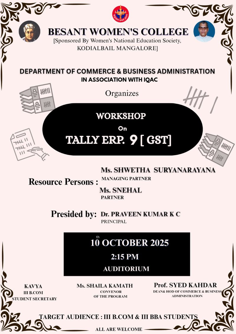 The program was presided over by Dr. Praveen Kumar K.C., Principal, Besant Women’s College. The event was coordinated by Ms. Shaila Kamath (Convenor) and Prof. S. Syed Kahdar (Dean & HOD of Commerce and Business Administration), with active support from Kavya, Student Secretary, III B.Com.